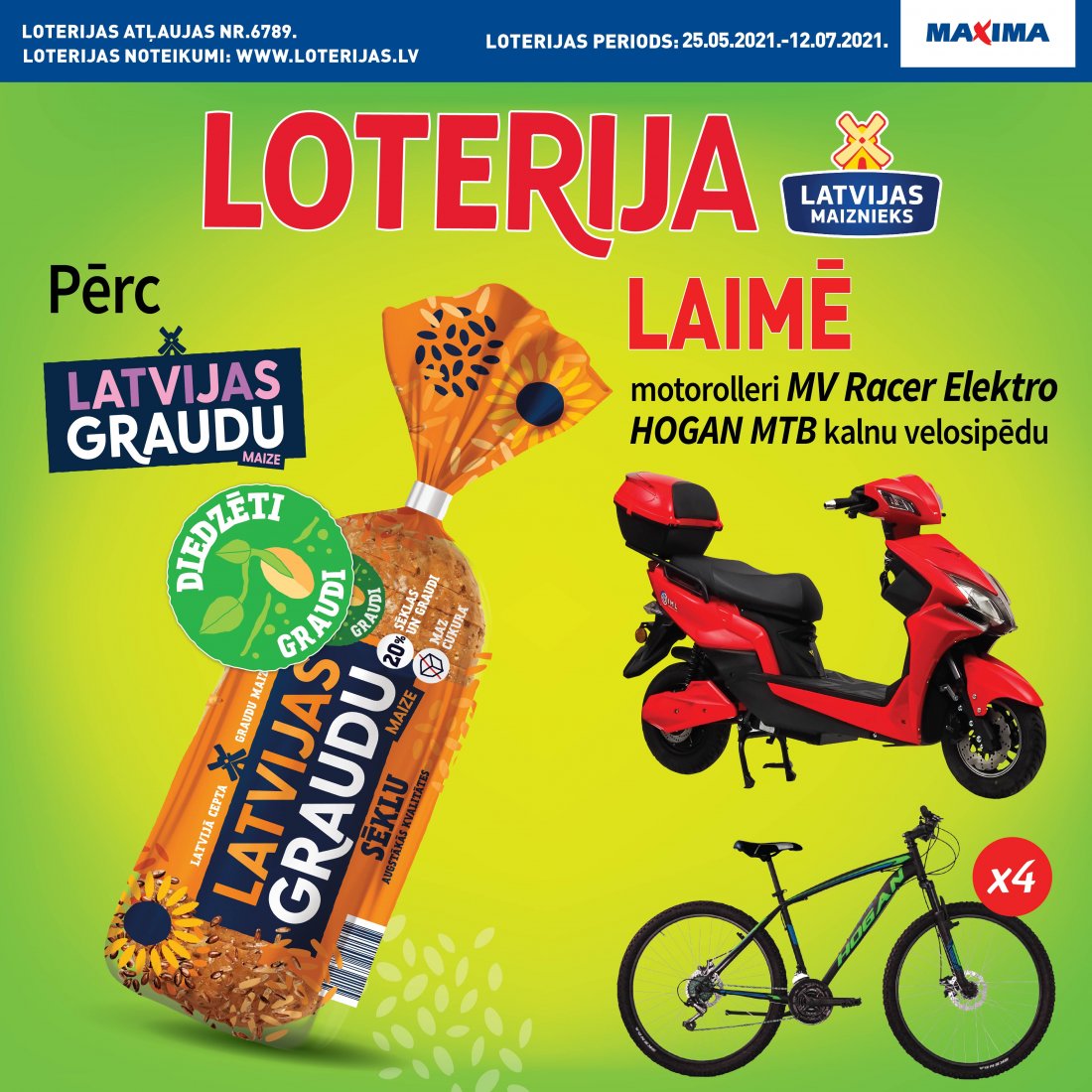 Līdz 12. jūlijam iegādājies Latvijas Maiznieks Graudu maizi veikalā Maxima vai interneta veikalā www.barbora.lv, reģistrē pirkuma dokumentu un laimē motorolleru MV Racer Elektr vai kādu no velosipēdiem Hogan MTB.